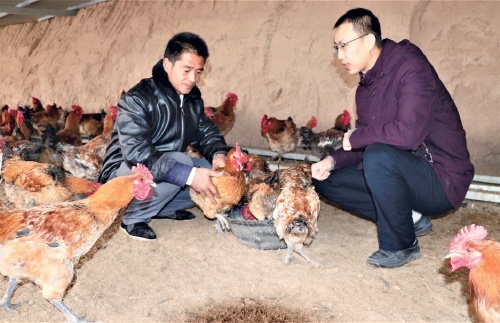 图为12月8日,驻村书记王栋在养殖场和饲养员一起查看肉鸡生长情况。(摄影:王毅)