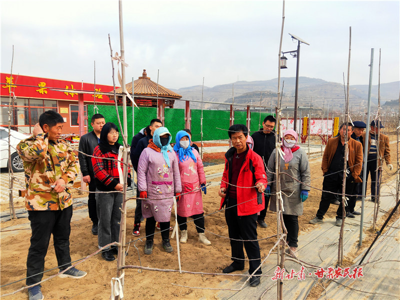 2月22日,静宁县处处洋溢着一片欢乐祥和的气氛,人们都沉浸在浓浓年味里。但在静宁县城川镇吴庙村瑞源果业合作社的示范园里,却开始了新年的忙碌。合作社的负责人吴进军正在为同村果农讲解苹果树现代矮化宽行密植栽培模式的管理和修剪技术。