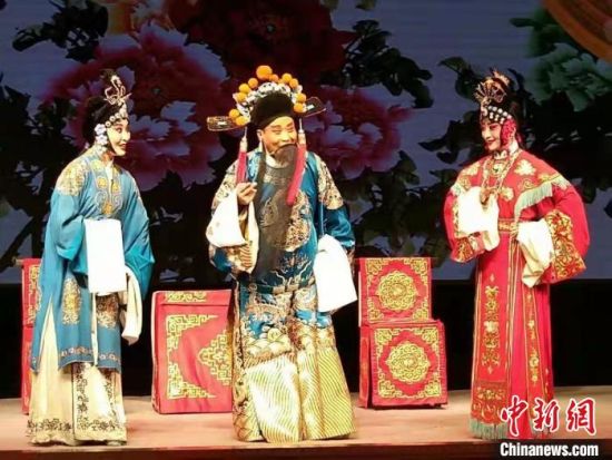 2月中旬,中新网记者采访甘肃省级非遗传承人赵希顺。图为赵希顺(左二)登台表演陇剧。