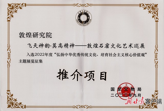 国家文物局近日公布了2022年度“弘扬中华优秀传统文化、培育社会主义核心价值观”主题展览征集结果,由敦煌研究院陈列中心承办的“飞天神韵 莫高精神——敦煌石窟文化艺术巡展”与全国100个展览一起成功入选。