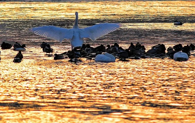 冬日的洮河,一改深秋碧绿的容颜,河面覆盖着晶莹剔透的冰珠,那成块成团的冰珠似梨花雪团,把洮河妆捞成一道飘逸素洁的白练,且最近这几年水质改善的原因,越来越多的候鸟栖息在洮河越冬。