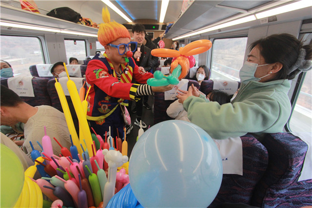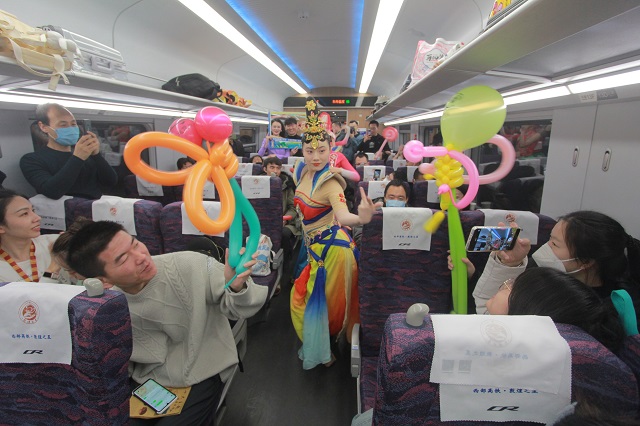 火车疾驰,车窗外的风景越发凸显春天的颜色。车厢里,文艺轻骑兵巡演更吸睛,“百鸟朝凤”,飞天起舞,裕固族少女轻盈地跳着、舞着,川剧变脸拉近了与川渝伙伴的距离,欢快的旋律提振鼓气,可爱的小丑不但给旅客带来快乐,还送去了甘肃文旅宣传品和丝绸之路(甘肃)自驾游护照等硬核伴手礼,瞬间圈粉。
