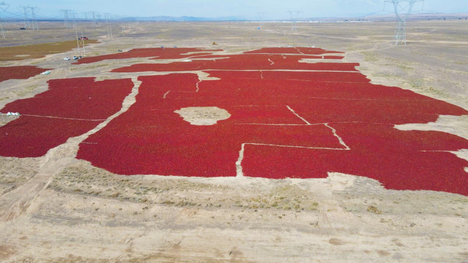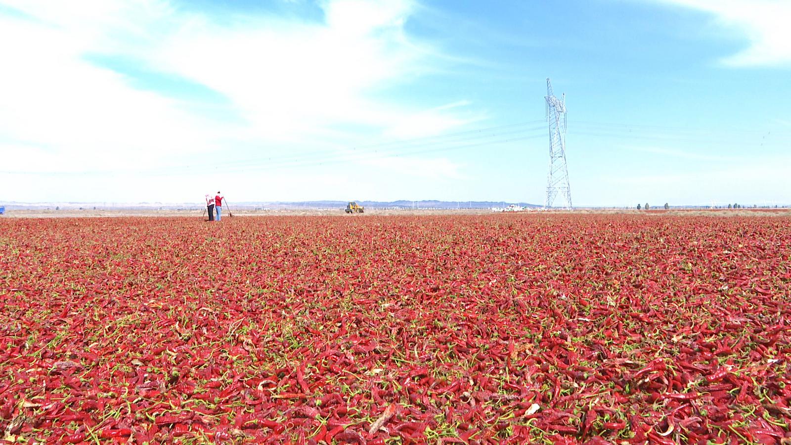 走进永昌县水源镇的辣椒晾晒场,放眼望去,一片片“红色地毯”映入眼帘,遍地的红辣椒被有序的铺开,村民们来回穿梭忙着搬运、摊平、晾晒辣椒。