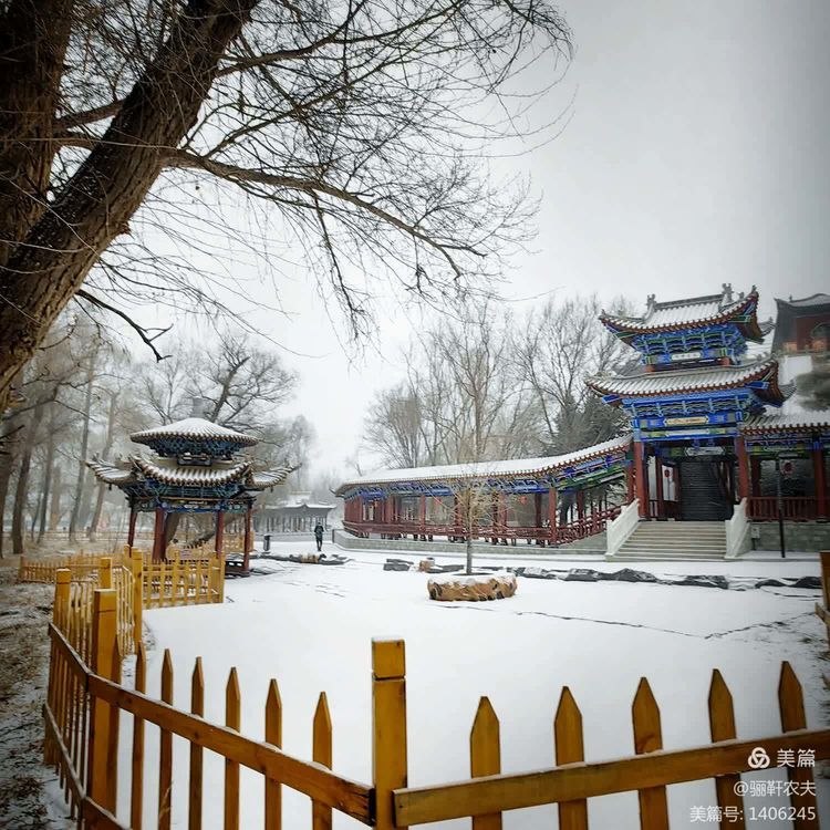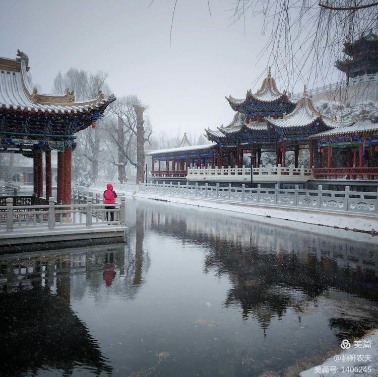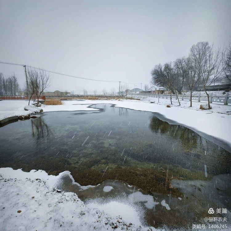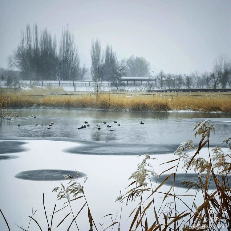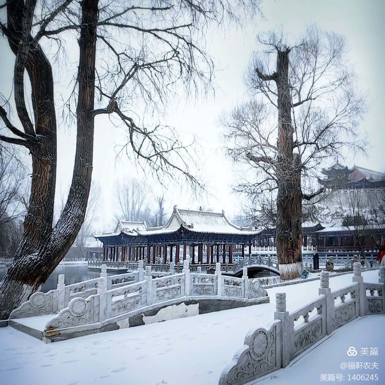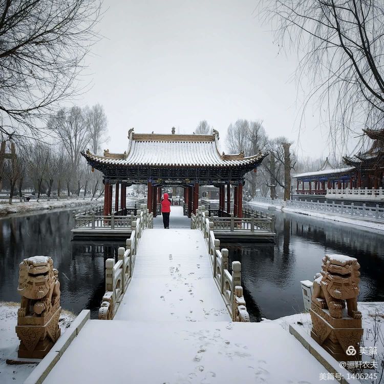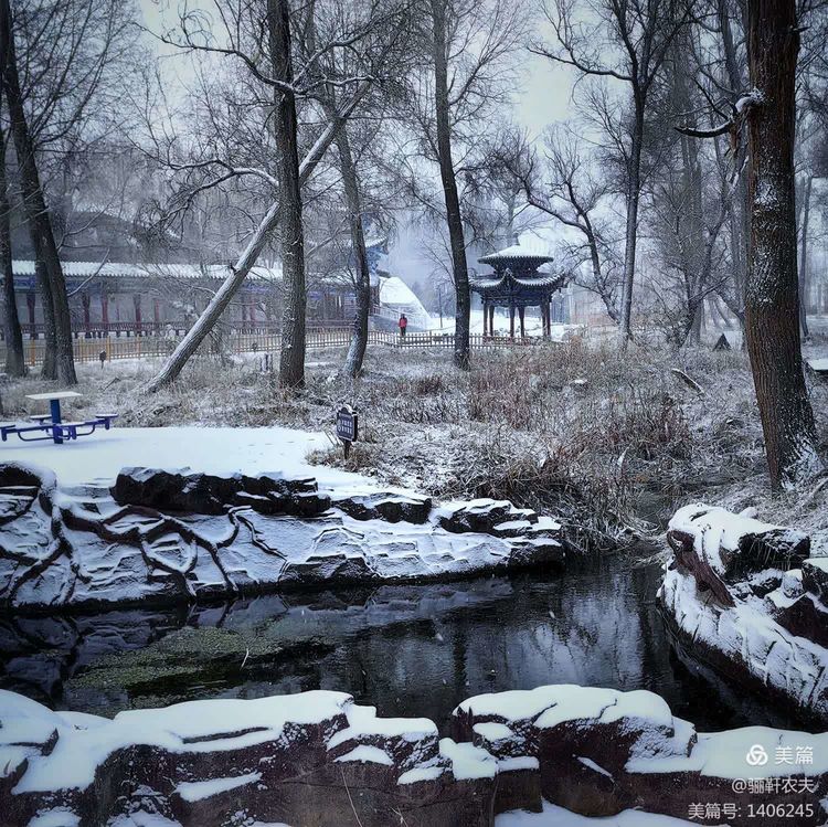 雪花纷纷扬扬给湿地的草坪铺上了一层厚厚的雪被,泉水在冰冷的小溪里缓缓流淌,呈现出深邃而神秘的色彩,冰冷的泉水与雪白的草坪交相辉映构成了一幅幅绝美的画卷!近处的亭台、古树在雪的映衬下更加美丽,在湖水中倒映出点点轮廓相辅相成,相映成趣构成一幅和谐的冬日图景!