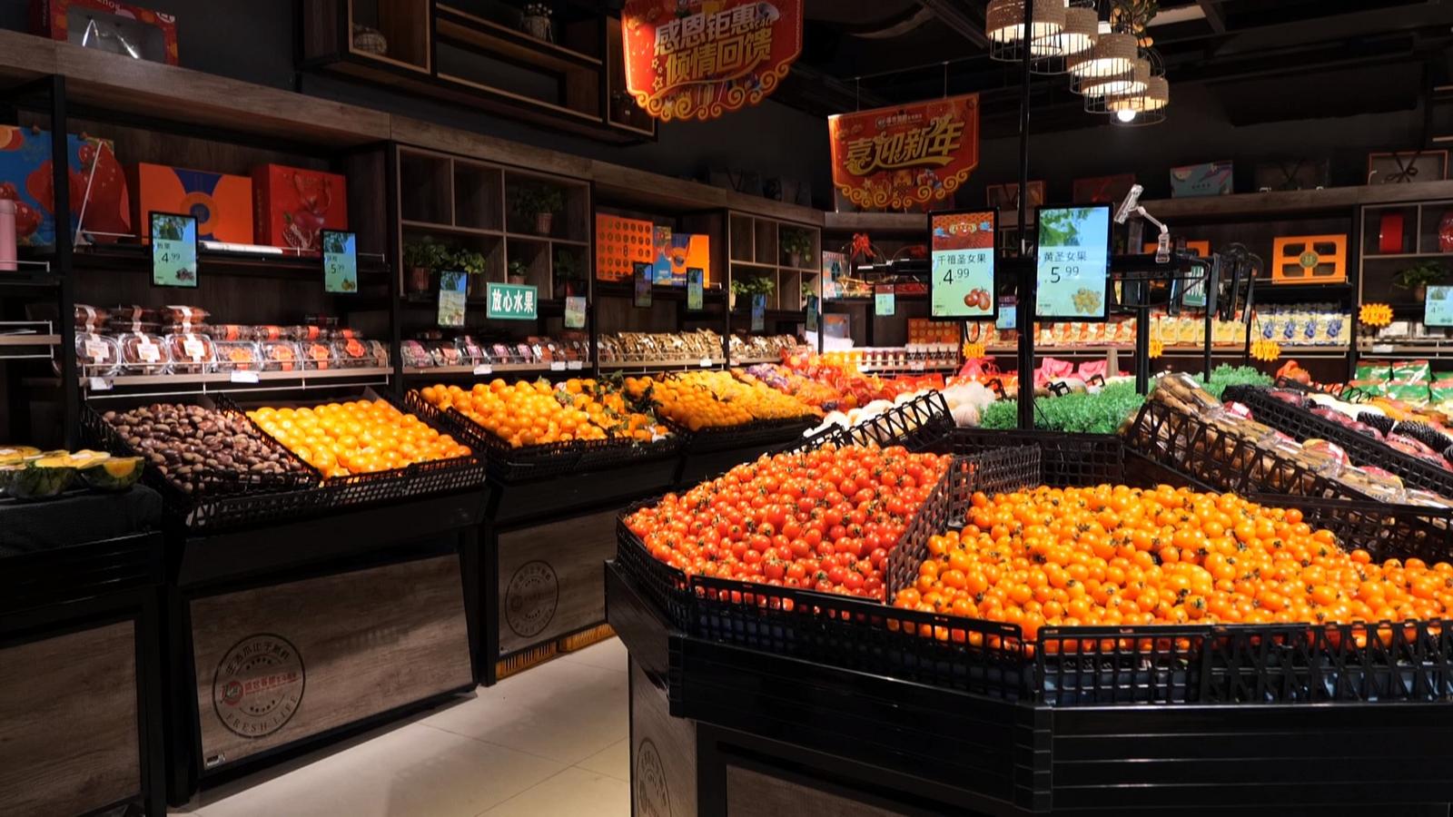 市民们也纷纷加入到年货置办的消费大军中。超市内,市民们穿梭于各个货架区域间,精心挑选着所需年货与生活物品。在各个货架区域,水果、蔬菜、肉制品等商品摆放有序,所有商品明码标价,各个区域均有专人负责,并及时补充货源。