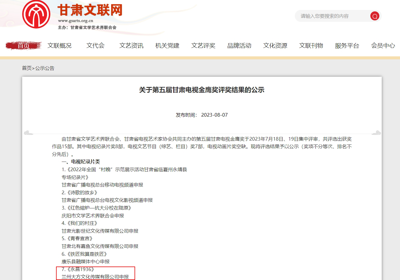 由甘肃省文学艺术界联合会、甘肃省电视艺术家协会共同主办的第五届甘肃电视金鹰奖于2023年7月18日、19日集中评审,共评选出获奖作品15部(奖项不分等次、排名不分先后)。其中电视纪录片奖8部,电视文艺节目(综艺、栏目)奖7部,电视动画片奖空缺。《永昌1936》获电视纪录片奖。