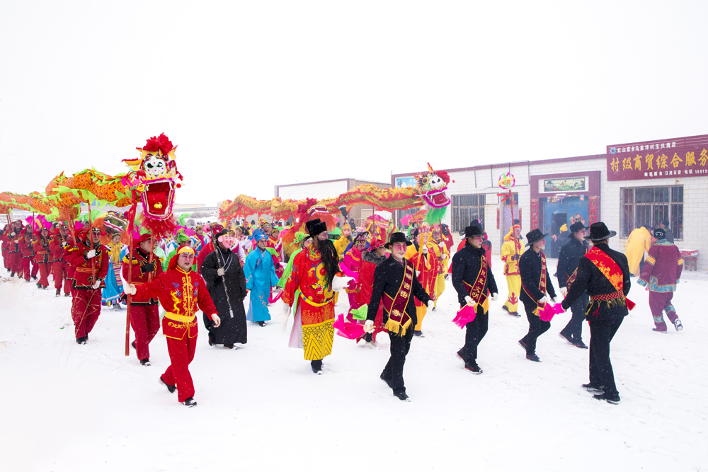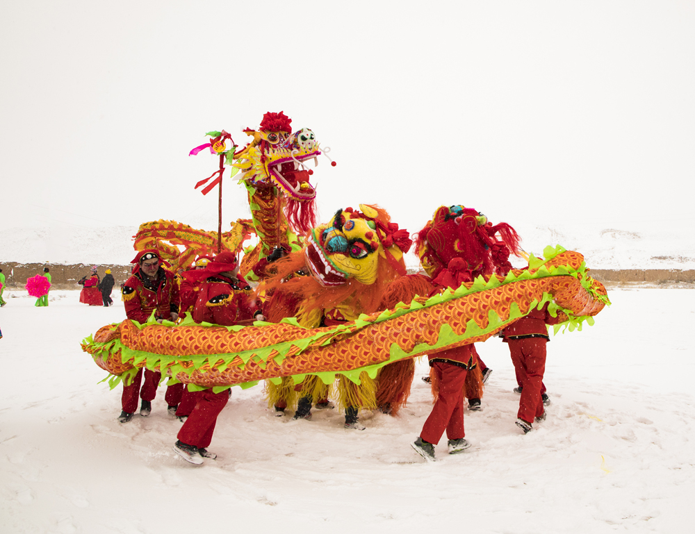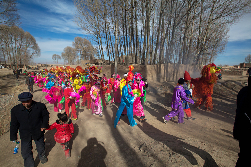 看着社火队热气腾腾杀过来,这边有一队人高举大扇踏着社火队的步伐扭着摇着迎了上去,据说这叫“迎社火”。待老爷们坐定,主人家开始敬酒,一个穿绿袍的老爷过来说:来,滕丫头,四季发财。脖子里被系了一个红被面,谢谢都没说出口就被卷进了社火队里,推的推,拉的拉,淘气的“呆公子”搂过我满脸蹭,顿时一个大花脸。我细看,竟是同村的婶子,已经又“霍霍”了好几个人蹦跶远了。