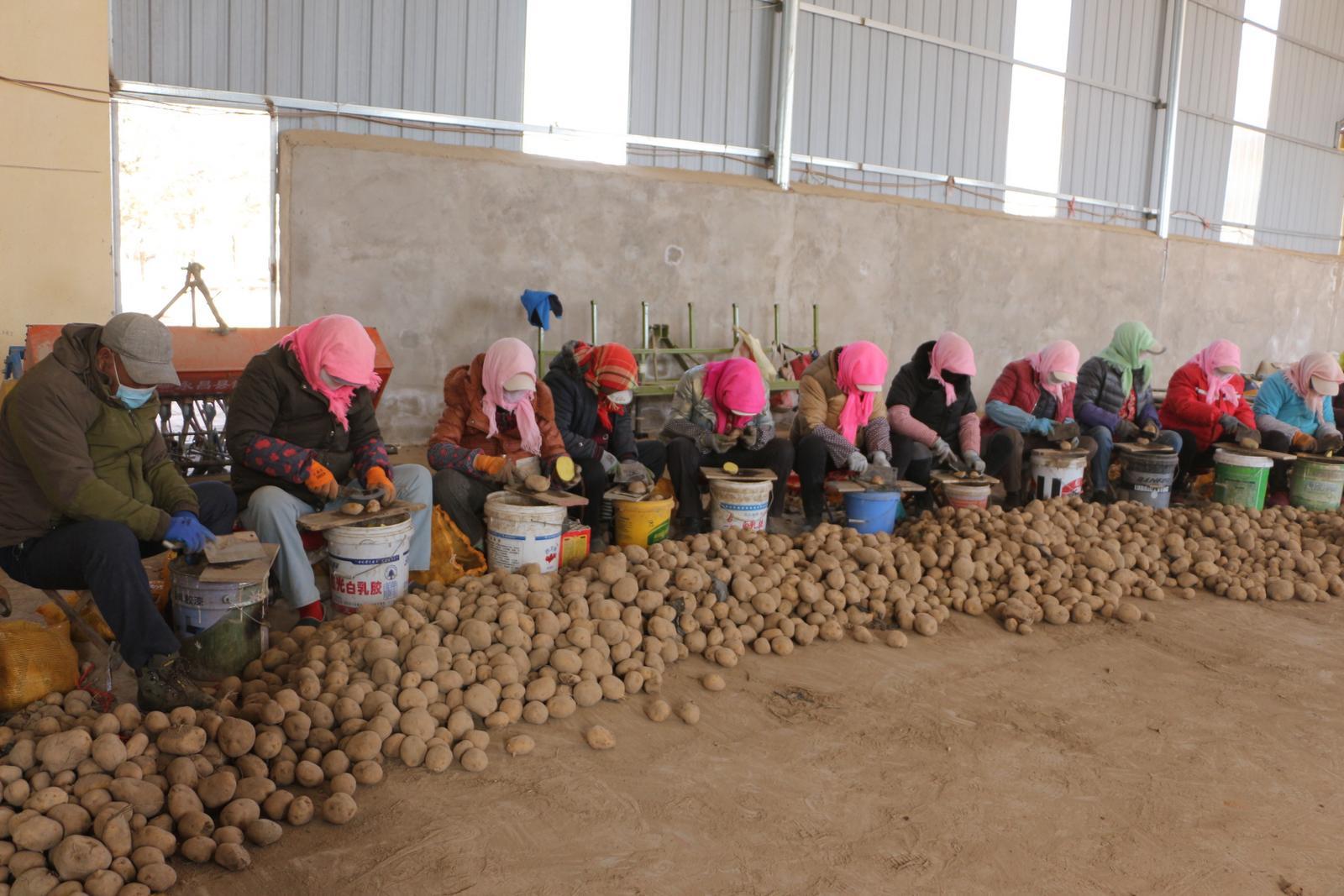 近日,随着天气逐渐回暖,新城子镇兆田村党支部领办合作社的仓库大棚里,群众正在进行马铃薯播前切块,大家有条不紊地进行马铃薯搬运、筛选、切块等工序,展现出一派热闹繁忙的春耕图景。
