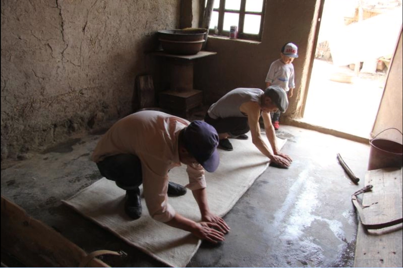 制毡是一种比较粗糙的手工技艺,毡匠这一行当容易学会,只要跟了师傅,能吃苦的青壮年男子都可学做,在技艺上没有什么可保留的秘诀,故有些家族男丁多,就合伙三五个人来制毡,这也起到了一种以师带徒的传承作用。