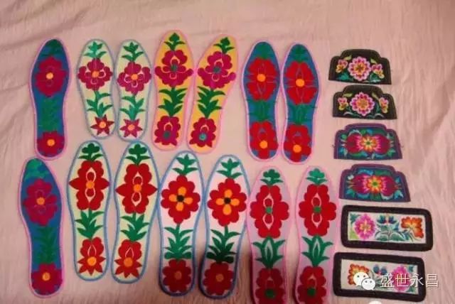 永昌刺绣用料以黑、白、红、蓝绣缎为底,用色彩对比强烈的绣线,注重画绣结合,讲究针法和绣线的运用,绣品色彩浓烈,针法细腻。大致可以分为服饰、生活用品、祭献物品三大类。服饰刺绣多为妇女布鞋、袜底、袜跟和儿童虎头鞋。生活用品常见的有枕头、鞋垫、荷包、香袋等,大都绣以“二喜蹬梅”“龙凤呈祥”等吉祥图案或其他花鸟虫草。婚嫁缝制的方型合枕,两头绣以鱼采莲、鸳鸯戏水等图案。“鞋垫”常常作为未婚女青年赠送未婚夫的礼物。“荷包”,有装钱、装烟等不同用途。“针敝”,是供妇女插针使用的日用品。“香袋”是妇女胸前装饰挂件和结婚时用来赠送亲友的礼品。“钥匙套”,是妇女外出时常常佩带在身上的日用品。祭献物品常常用于祭扫礼仪的灵堂、殿宇的帷帐、神龛帷幔等饰有龙凤仙鹤、福禄寿禧、明暗八仙等,还有的绣制送葬礼仪用的“棺罩”和亡人的“寿衣”、“鞋帽”等。“砌花”是妇女用各种彩色碎布条布片依形连制的各种生活用品。像垫子、书包、马搭等。