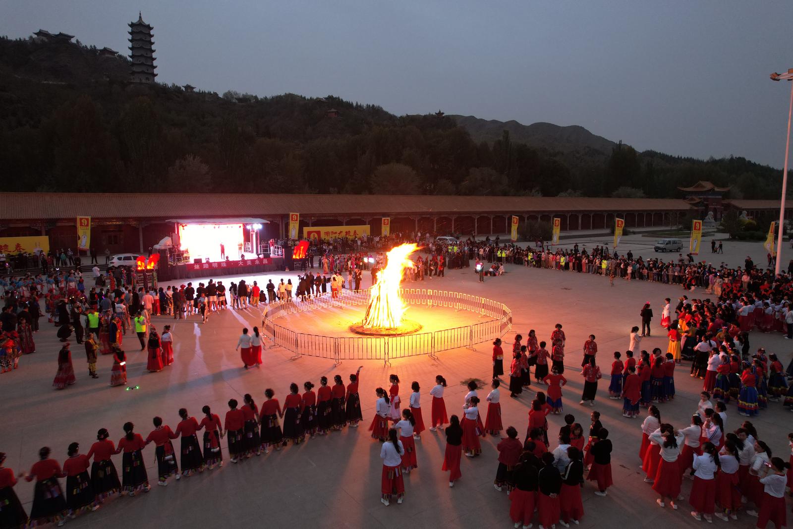 5月17日晚上8时,2024年金昌市“5·19中国旅游日”暨“5·18国际博物馆日”系列活动——“火红民俗 激情永昌”大型篝火晚会在武当山文化广场火热举行。随着夜幕降临,在武当山文化广场上游客相约而来,人头攒动,一场热情洋溢的篝火晚会如约而至,大家载歌载舞,共同欢度这个迷人的夜晚。