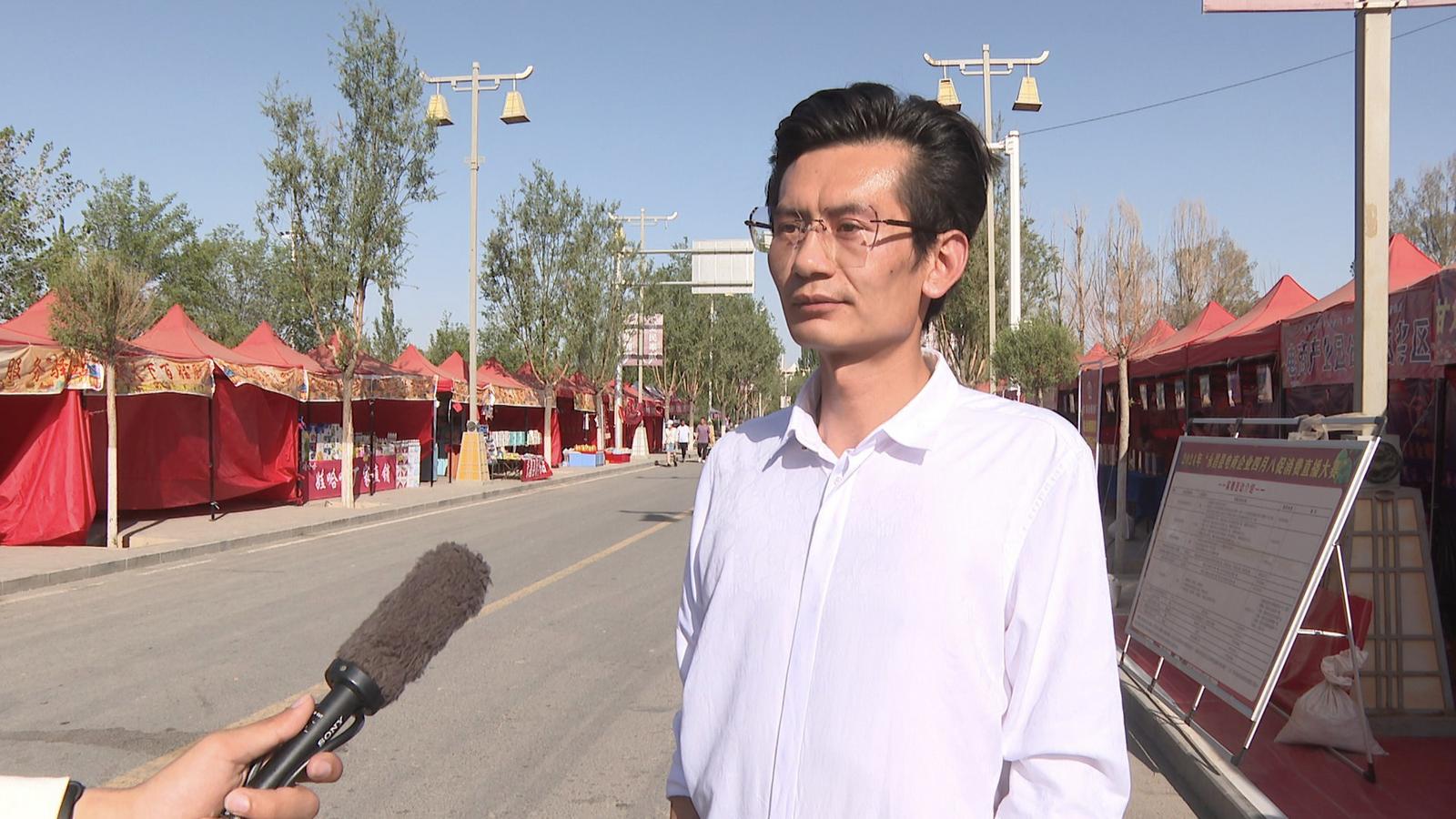 甘肃慕森网络科技有限公司总经理 张文骋:我们电商厂业园在四月八商品展销会上,主要是销售永昌羊肚菌、藜麦、亚麻籽油、大麦茶、永昌酒等,目前线下成交额为8万余元,希望通过我们大家共同的努力,让更多的人都能知道我们永昌的特色产品。