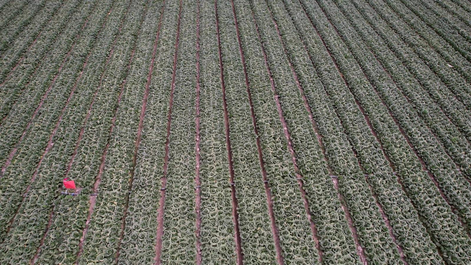 采收现场,一大片绿油油的娃娃菜长势喜人,墨绿色的叶片肥厚鲜嫩,一个个装满娃娃菜的白色菜筐分散在田地上,只见采收下来的娃娃菜叶片包裹紧实、色泽鲜亮,犹如一颗颗黄绿白相间的宝石。随后,工人们将整筐娃娃菜装车送往基地进行进一步加工处理。