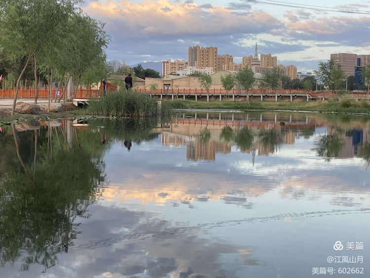 湖心亭的水和后海子水为晚霞夕照赋予了自然的灵气,平静的水面光洁如镜,静美的云霞颜色清晰,水天之间的色彩交相辉映,清晰的倒影,这也是永昌北海子独特魅力所致,水为这里的大地灌注了蓬勃的血脉,滋养了一片片绿洲湿地,也为这里塑造了美不胜收的独特景观。