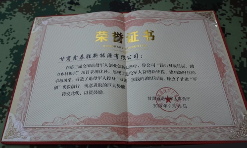 今年9月,静宁籍退役军人刘亚东创办的甘肃鑫泰胜新能源科技有限公司代表甘肃省军创企业参加第三届全国退役军人创业创新大赛,荣获新兴产业赛道优胜奖。