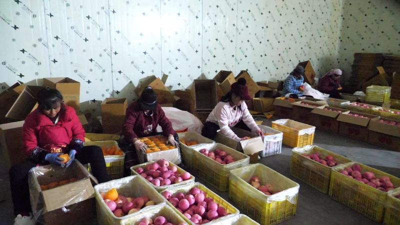 随着庄浪苹果进入销售旺季,苹果入库贮藏工作也正火热地进行着。在赵墩乡的气调保鲜库,装满苹果的大筐子摆满院子,工人们正忙着分选,再装成小纸箱入库贮藏。
