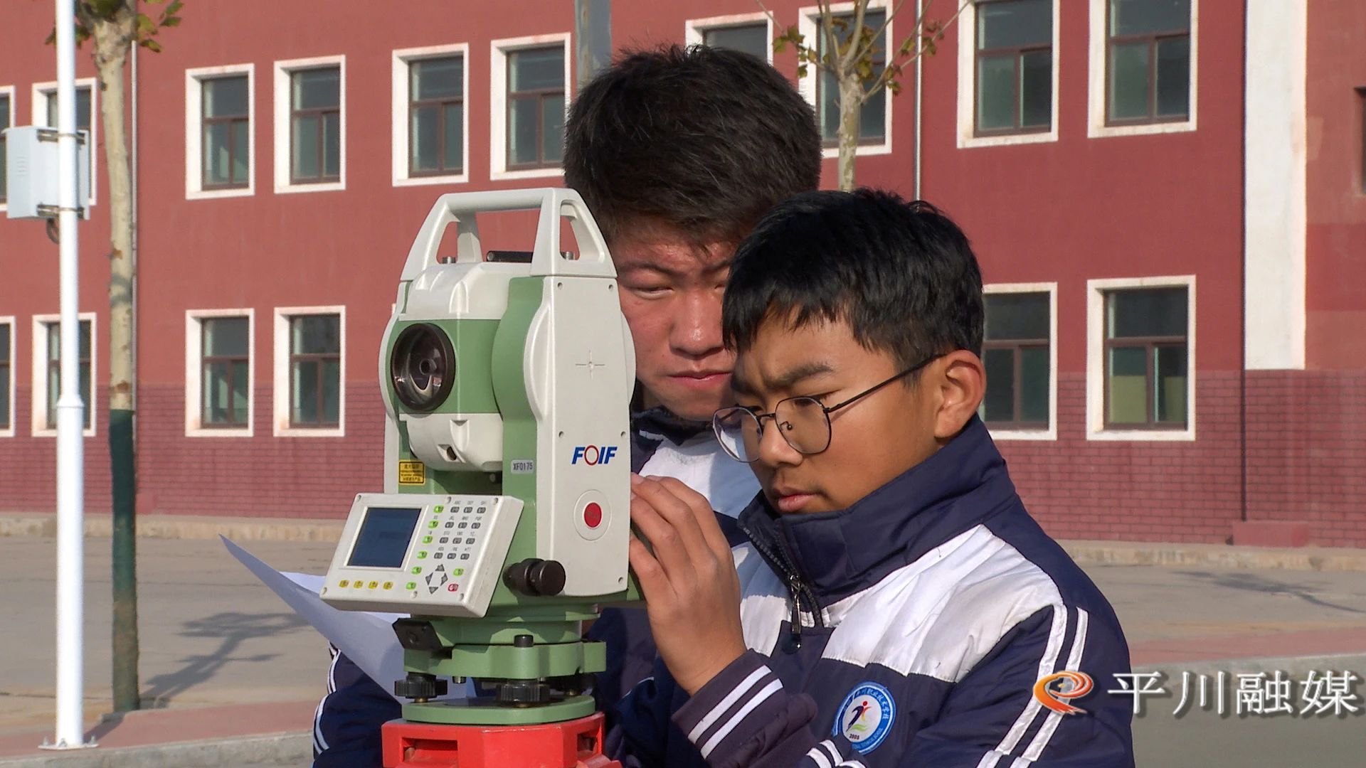 在平川职业技术学校,学生刘继正拿着测量仪采集数据,进行工程测量比赛。为提高自己的测量技术水平,他每天手扛着十几斤重的测量仪器,在大楼、草坪、道路等点位之间不断穿梭,靠近、远离,蹲下、起身,一项项调准、一遍遍计算,确保数据准确无误。