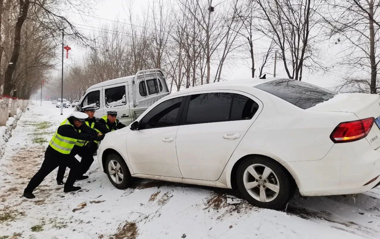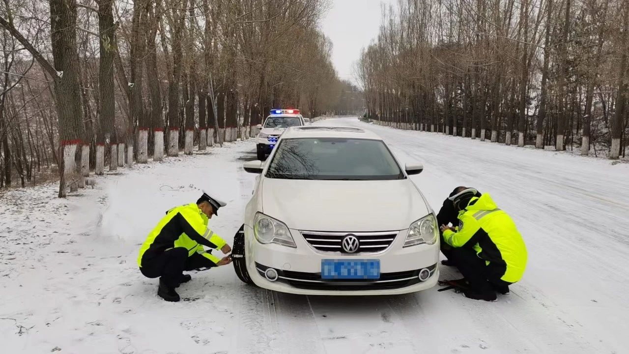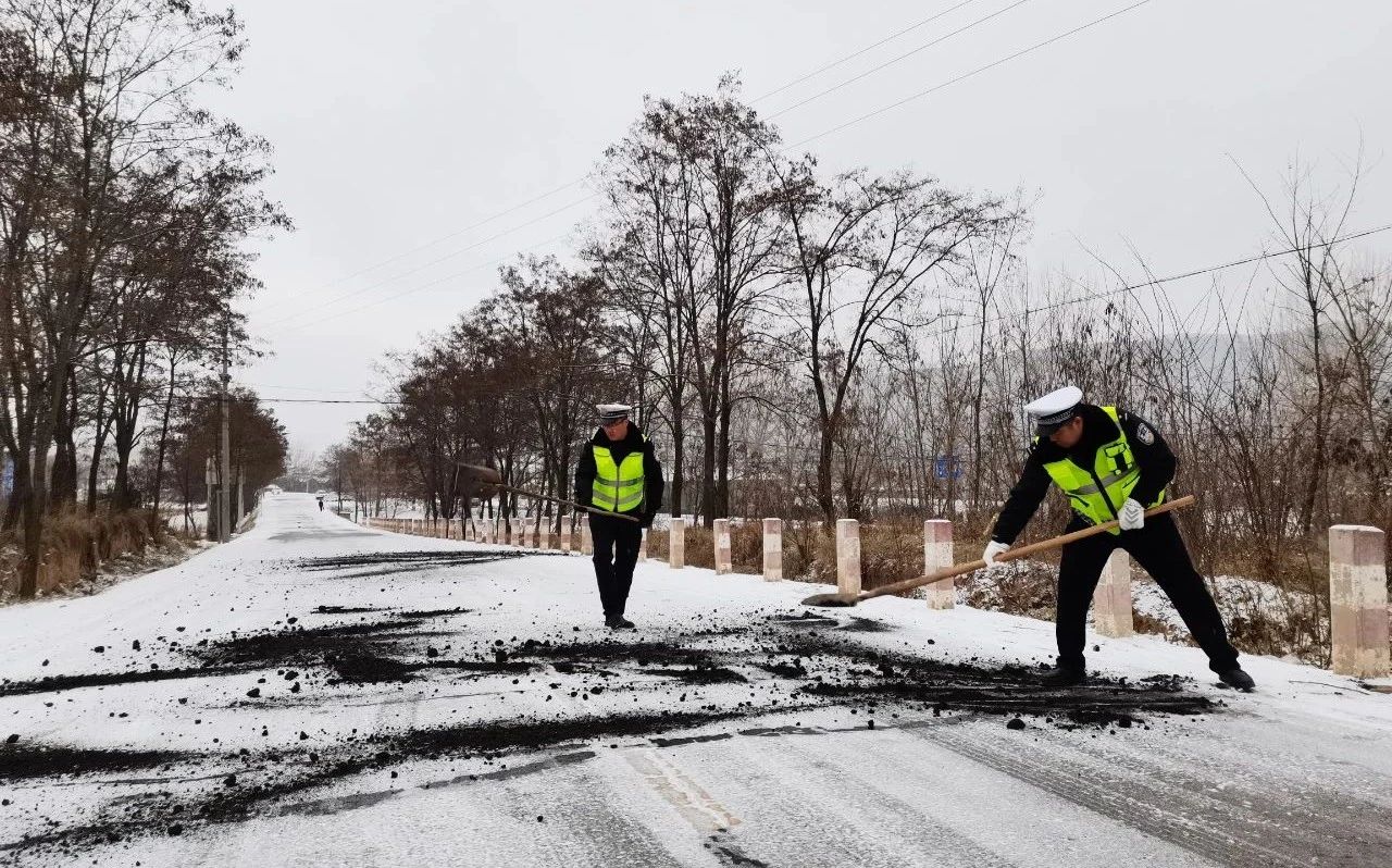 良邑派出所最大限度把警力投放一线、压向路面,通过定点疏导与动态巡逻相结合的方式,及时清理道路积雪,帮助救援受困车辆,协助驾驶员安装防滑链并有效分流劝返滞留车辆,切实服务群众平安出行。