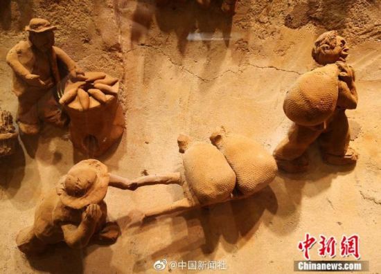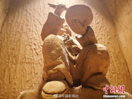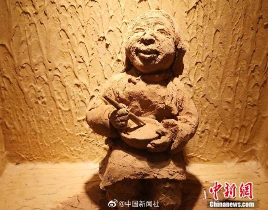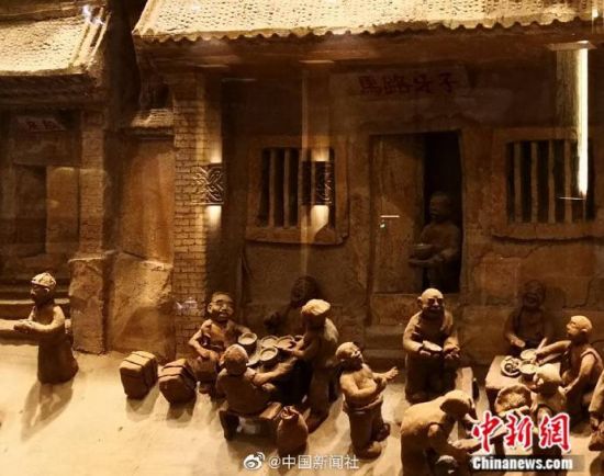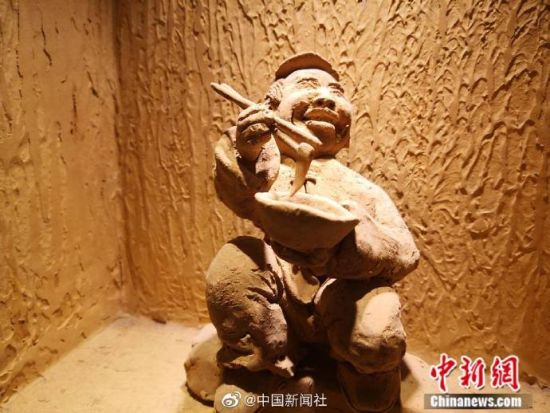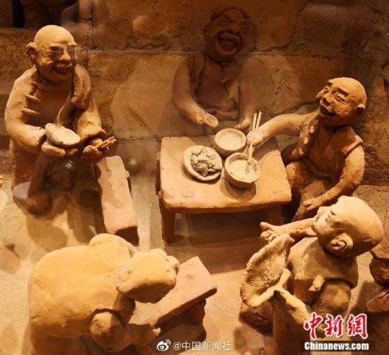 早年间,兰州马路牙子(北方方言)上,随处可见端一碗牛肉面或蹲或站着大口吸溜面的人,这也成为兰州旧时一大景观,为留住情怀,兰州马路牙子牛肉面馆将这一饮食文化用泥塑的方式再现出当时场景。(记者 刘薛梅)