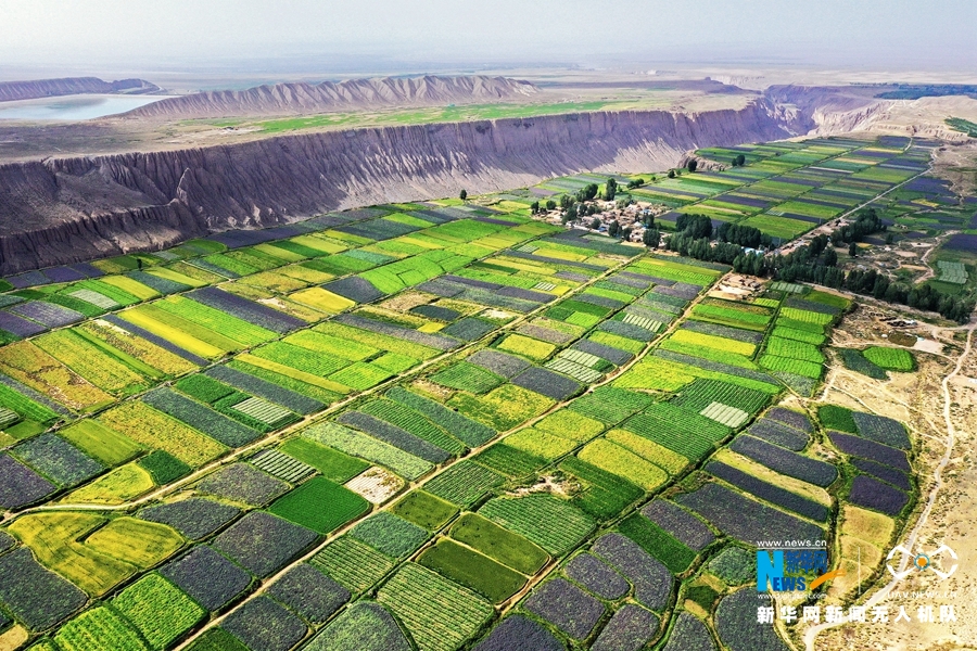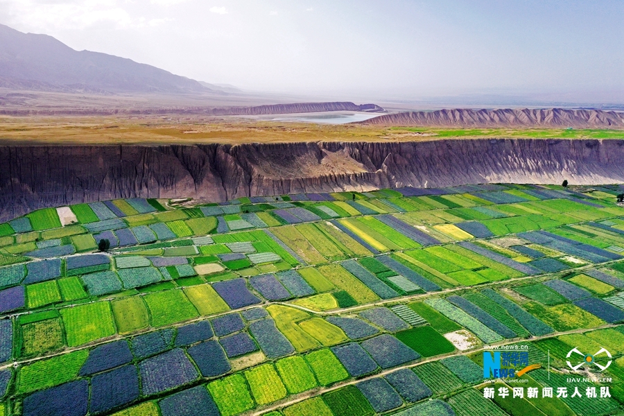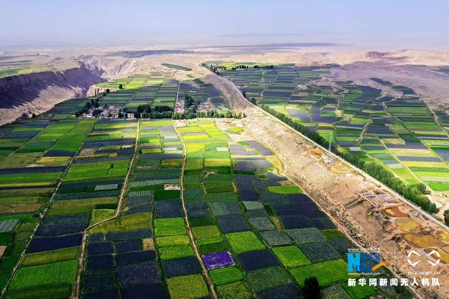 盛夏时节,甘肃省张掖市高台县新坝镇红沙河村马营河畔的制种花田内,各色花卉缤纷绽放,从高空俯瞰宛如一块巨型“调色盘”。