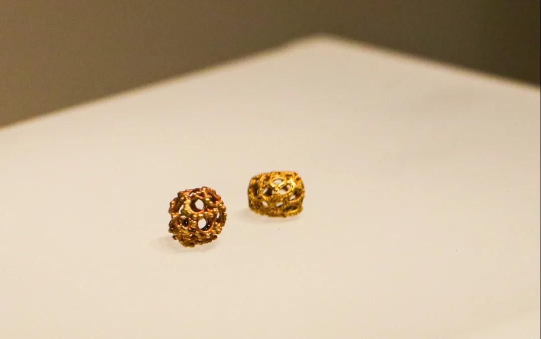 魏晋累丝焊珠空心球饰,魏晋,武威市凉州区金沙乡赵家磨南滩魏晋墓出土。直径1厘米。黄金质,用金丝线累编成空心扁圆球状,丝线表面布满细小焊珠。为研究魏晋时期的黄金工艺饰品提供了珍贵的实物资料。