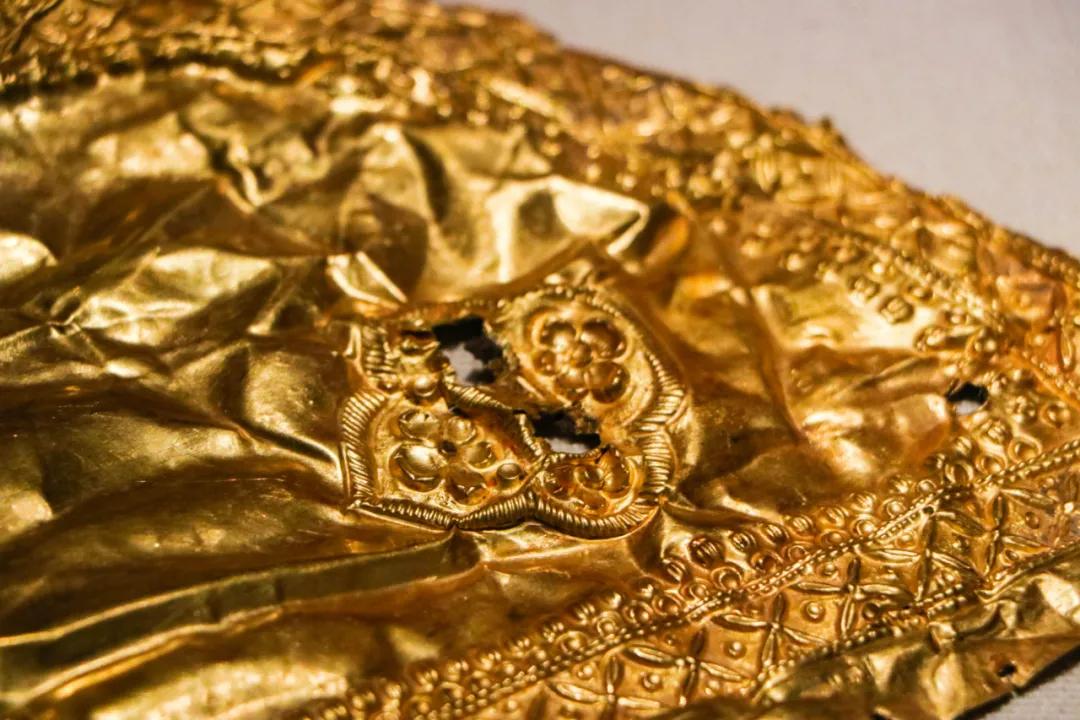 唐梅花纹金饰片,唐代,武威市凉州区高坝镇清水村征集。长22.9厘米,宽14厘米。金饰片扇面形,三边有数个小洞,应为与某物附着时的连接点,中有镂空梅瓣装饰。