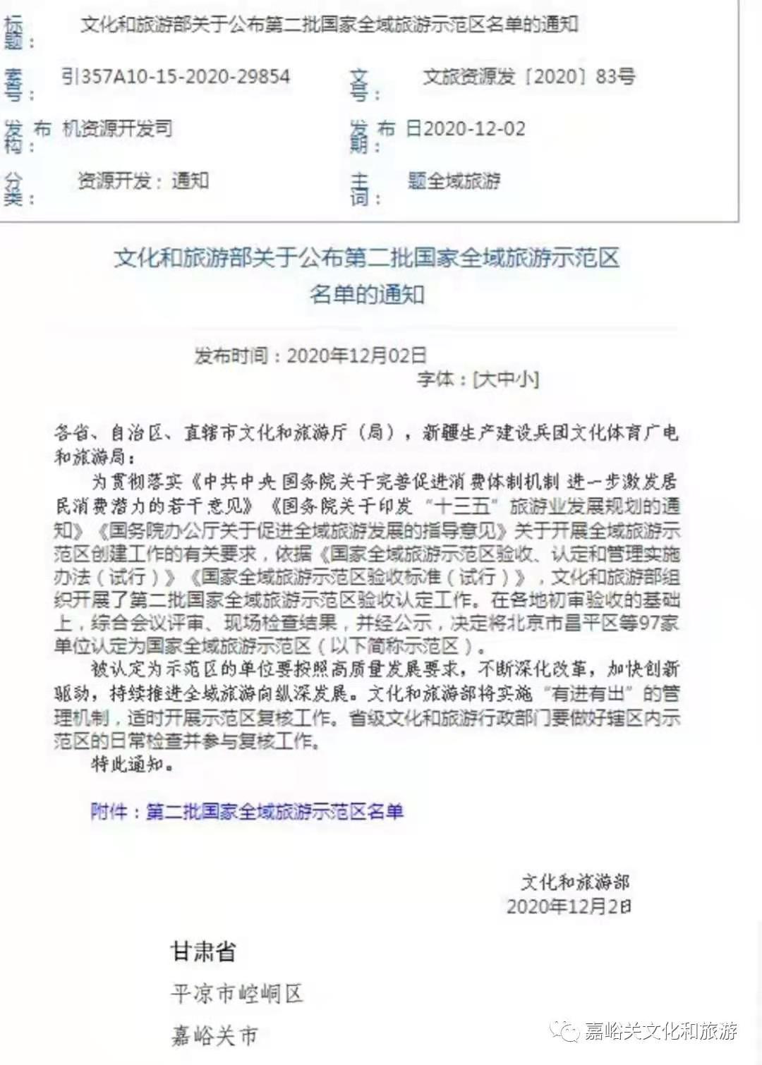 全域旅游示范区成功创建。根据国家全域旅游示范区认定总体要求和验收细则,及时召开推进会,制定整改清单,逐一整改存在问题,编印资料汇编,制作提交创建汇报专题片,参加现场答辩和文旅部专家组的暗访。12月2日文旅部公布第二批国家全域旅游示范区名单。至此,经过3年的努力创建,嘉峪关市成功创建国家全域旅游示范区,成为全国唯一入选的地级市。