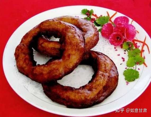 定西通渭荞圈圈是一种古老的传统面食。以开水烫荞面,拌少量小苏打,调成糊状,旋入特制的木勺或铁勺中,用八成热的油炸至棕红色捞出。瞬时香气四溢,入口松软香酥,口感丰润细腻,加之天然的甜味,让人垂涎,咀嚼时别有风味。