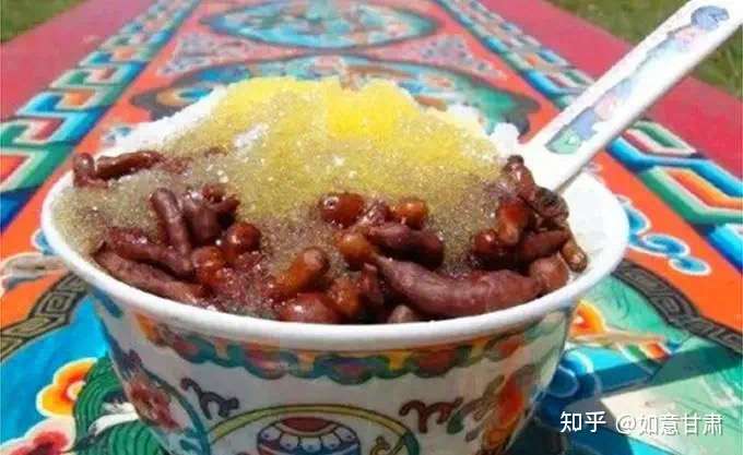 在甘南,将特产蕨麻和米饭混合在一起,一样一半盛在碗内,再撒上白糖,浇上牦牛酥油汁,一碗香喷喷的蕨麻米饭就制成了,食用时用勺子边搅边吃,甜而不涩,带来不一样的味觉体验!