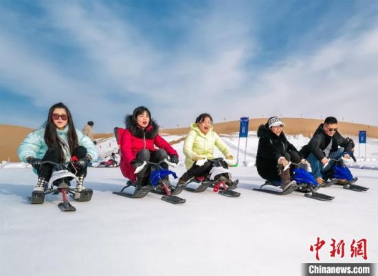 图为新年伊始,游客在敦煌沙漠露营基地享受滑雪的乐趣。张晓亮摄