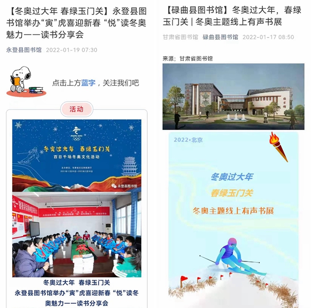 增强服务产品供给,满足人民群众精神文化需求。主动适应公众阅读习惯、媒介传播方式变化和群众多样化、多层次、多方面的文化艺术需求,统筹疫情防控,线上线下相结合,系统推进“全民阅读推广”和“繁荣群众文艺”工作,进一步丰富了群众精神文化产品供给。围绕庆祝建党100周年,举办了“红色经典诵读”“陇韵书香节”阅读推广和“唱响新时代”群众合唱、“舞动陇原”广场舞展示展演活动,在活动中向人民群众讲好党的故事,在活动中让人民群众感受党的百年艰辛历程、巨大变化、辉煌成就。围绕喜迎2022年北京冬奥会,省文旅厅突出快半步落实,充分发挥文化传播力量,在全省范围内广泛开展“冬奥过大年·春绿玉门关”百日千场冬奥文化活动,在活动中讲好中国故事,展示中国文化、中国形象,在活动中展现如意甘肃的独特魅力和浓郁风情,在活动中满足人民群众精神文化需求。