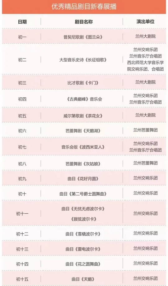 虎啸春来辞旧岁,春风浩荡启新篇!兰州大剧院恭祝全市人民新春快乐,虎年大吉!在新春佳节期间,为满足观众对精神文化生活的需求,兰州大剧院在疫情防控新形势下精心策划,初一至初十五将采用“线上演播”的模式,每天一部“优秀精品剧目新春展播”,包括歌剧、合唱、芭蕾舞剧、交响音乐会等艺术形式,足不出户,便可品味高雅文化大餐,为观众们奉献一个文化味儿浓郁的新春佳节!