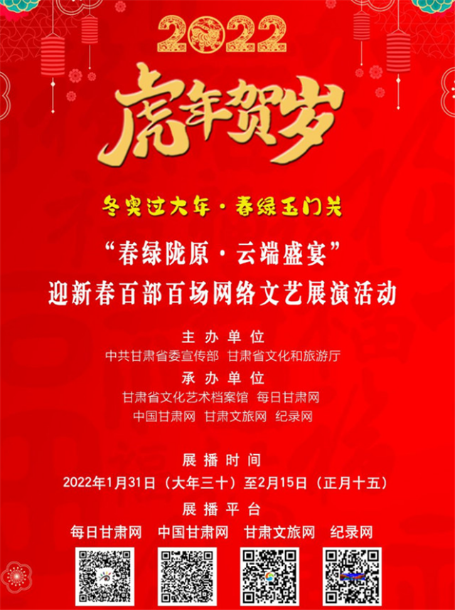 “春绿陇原”文艺展演贺新春。“春绿陇原·云端盛宴”迎新春百部百场网络文艺展播活动为广大群众在春节期间带来了前所未有的文艺盛宴。展播内容种类繁多,艺术样式丰富多彩,涵盖综艺晚会、交响乐、歌舞剧、戏曲、杂技、曲艺、非遗展演、戏剧影视作品等多种类型,突出时代主题、民族特色和地域文化。一大批近两年甘肃省新创作的优秀舞台剧目,也首次在“云端”展演,有入选中宣部、文旅部、中国文联“庆祝中国共产党成立100周年优秀舞台艺术作品展演”的话剧《八步沙》、舞剧《彩虹之路》、音乐剧《达玛花开》,也有入选文旅部庆祝中国共产党成立100周年“百年百部”舞台艺术精品创作工程的陇剧《官鹅情歌》等优秀舞台艺术精品。秦腔《肝胆祁连》、音乐剧《焉支花开》、京剧演唱会《信仰之光》、陇剧《江姐》等红色题材剧目和文艺晚会,带领观众重温党的百年奋斗历程。庆祝建党100周年文艺晚会《各族人民心向党》、音乐舞蹈史诗歌《裕固儿女心向党》、民族舞剧《盛世锅庄》、歌舞晚会《花儿临夏在河之州》,展示了多姿多彩的陇原民族风情。省内各地策划举办的迎新春文艺晚会也在网络展演中与广大观众见面。