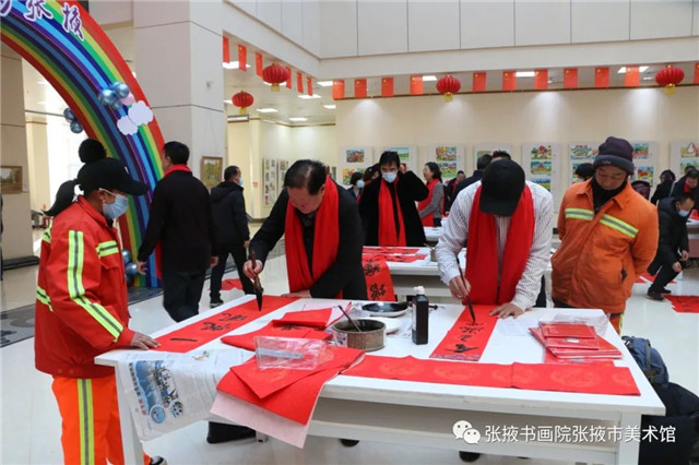 丹青绘祥瑞,笔墨印春色。作为一种独特的文化符号,春联承载着汉字与书法的特质,在上千年的传承中长盛不衰。深厚的人文底蕴、包容的文化气质、浓郁的艺术氛围、多彩的创作题材,使张掖这片热土成为艺术作品尤其是书法作品萌生的土壤。在春节前夕,张掖书画院、张掖市美术馆举办的迎春送福惠民行“增年味暖民心”文化惠民活动中,张掖的书法家们把一幅幅浸润着他们对家乡张掖热爱之情的春联化作美好的祝愿,现场挥毫泼墨,为30多位环卫工人、社区党员代表书写赠送春联900多幅、“福”字和年历300多张,以文化的形式给城市美容师、社区基层群众送去喜迎佳节的真诚祝福。全市各县(区)文化馆、美术馆的艺术家们也结合“文化进万家”活动深入基层,写春联、绘春色,通过一封封“写给岁月的红色情书”寄托人们对美好生活的向往。