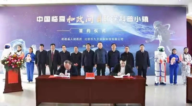 临夏州委常委、州委秘书长李文瑞,州委常委、州委宣传部部长邵志刚,州委常委、副州长马超,甘肃省美育教育促进会会长谢建华,北京九天微星科技发展有限公司董事长谢涛,北京九天未来科技发展有限公司首席运营官黄梁、业务总监冯帅等出席仪式。仪式上,设计单位介绍了项目设计规划情况,北京九天微星科技发展有限公司、北京九天未来科技发展有限公司分别与和政县签订了中国临夏“和政问月”航天研学科普基地建设项目合作协议和项目合同。