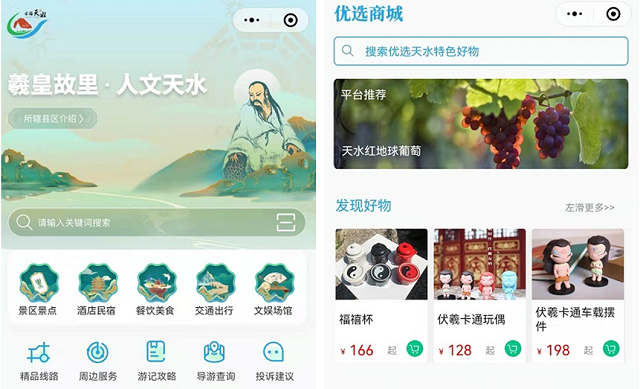 云游天水暨一部手机游天水平台,是甘肃文旅产业集团与天水市人民政府联合打造的综合性文旅服务平台。该平台以“文化品牌+旅游服务+市场化运营”为主要定位,以“资源展示、文化输出、游客体验”为核心,突出对天水市文化品牌和全市各县区的宣传,重点打造“景区景点、酒店民宿、餐饮美食、交通出行、文娱场馆、精品线路、周边服务、游玩攻略、导游查询、投诉建议”十个功能板块,并结合天水的特色文化,打造了“鉴阅天水、印象天水、遇见天水”三大特色文化专区。目前平台在线商家共计313家,上线文创特产商品400余件,实现了景区景点、文物非遗、精品剧目、文化民俗等文旅资源全景展示,线路推荐、导航导览、导游查询、游记攻略、紧急救援等城市周边服务设施查询及导航等便民服务,为游客提供了“吃、住、行、游、购、娱”等消费环节的全方位、一站式智能服务。
