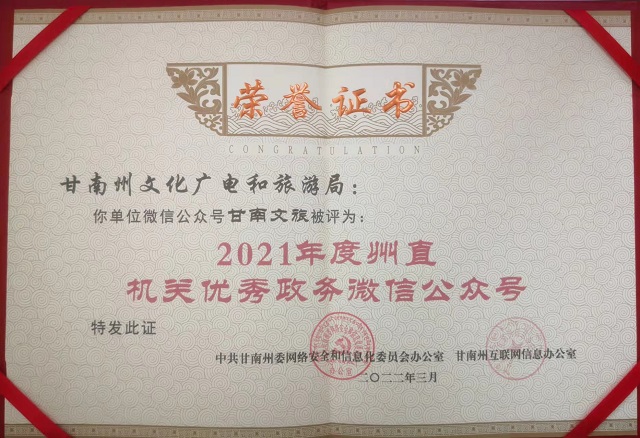 3月8日,在甘南州网信工作会议上,州委网信办表彰了2021年度27个网络传播优秀公众号,甘南文旅获得“州直机关优秀政务微信公众号”称号。
