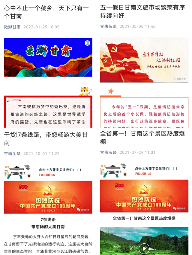 2021年,甘南文旅微信公众号坚持把做好宣传推广工作作为坚定文化自信、讲好甘南故事、传播甘南声音的阵地,依托成功举办“一会一节”开幕式形成的轰动效应,借助甘南荣获亚洲旅游“红珊瑚”奖和“十大最受欢迎文旅目的地”称号的强劲东风,拿出打破常规谋发展的决心魄力,着力在创新宣传方式、加大推介力度、实现轰动效应等方面出实招,切实把最新的思路、最好的智慧、最佳的方案、最强的力量汇聚到宣传推广工作上来,为甘南文旅高质量发展注入旺盛活力。