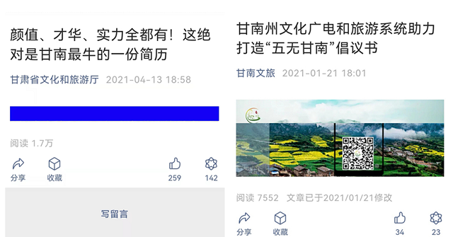 甘南文旅坚持对内抓工作信息总结提炼,对外主动向新闻媒体喂料,用笔墨光影传递主流声音,形成了一批有质量、有亮点、有影响的好稿件,为扩大文旅宣传工作发挥了重要作用。2021年度,甘南文旅微信公众号发布稿件734条,文化和旅游部网站采用6条,省文旅厅官方网站、微游甘肃采用120余条。原创稿件《甘南州文化广电和旅游系统助力打造“五无甘南”倡议书》发布后,好评如潮,浏览量、转载量迅速攀升,引发多方关注;原创稿件《颜值、才华、实力全都有!这绝对是甘南最牛的一份简历》在省文旅厅官方微信公众号发布后,浏览量达1.7万。