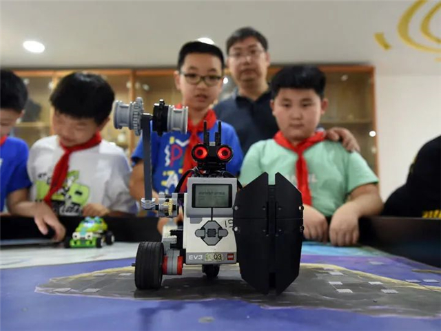 在合肥市和平小学,信息技术老师杨森(右二)在“课后三点半”时间指导机器人社团的学生(2021年9月8日摄)。新华社记者 周牧 摄