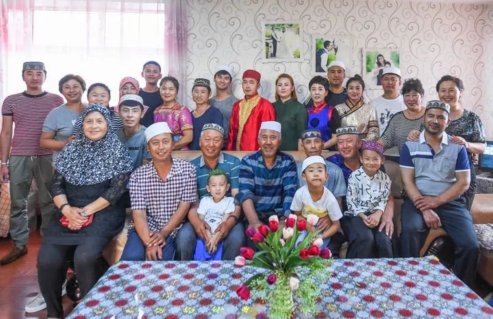 这是家住内蒙古呼伦贝尔的夏民山(前排右三)家的家庭合影。他家由回族、汉族、蒙古族、达斡尔族、鄂温克族、满族共6个民族组成,45口人,三代同堂(2017年7月16日摄)。新华社记者 连振 摄