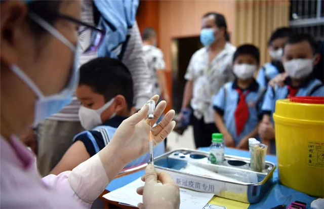 医护人员在海口市琼山第三小学为学生接种疫苗(2021年10月28日摄)。新华社记者 郭程 摄
