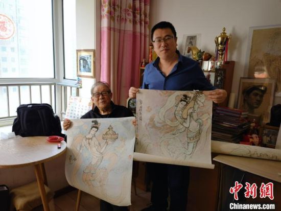 3月上旬,《丝路花雨·诞生》作者陈晓斌(右)拜访今年86岁的舞美设计师李明强(右)老先生。王先孟摄