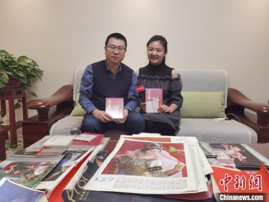 图为陈晓斌(左)向中新网记者介绍他所收藏的舞剧《丝路花雨》相关珍贵资料情况。崔琳摄