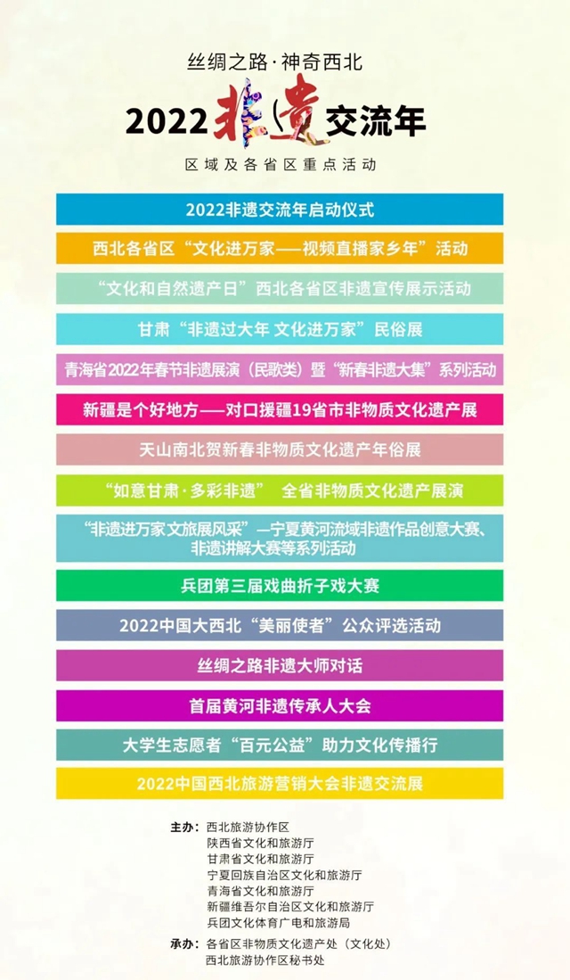 为了联合推广西北地区多彩的文化特色和丰富的旅游资源,向国内外讲好“丝绸之路·神奇西北”的文化和旅游故事,今年西北各省区和新疆生产建设兵团将联合举办2022“非遗交流年”主题活动,努力让社会认识西北地区源远流长、丰富多彩的非物质文化遗产,促进全区域非物质文化遗产交流、传承与活化。