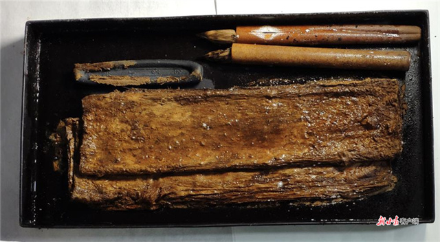 慕容智墓出土漆盒内的笔墨纸(中国社会科学院供图)
