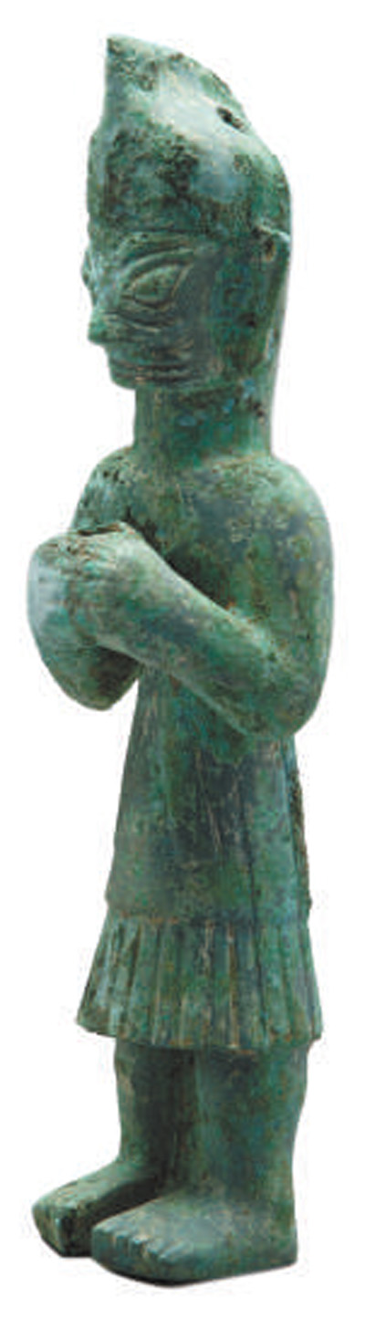 三星堆商代遗址出土戴尖帽铜立人像