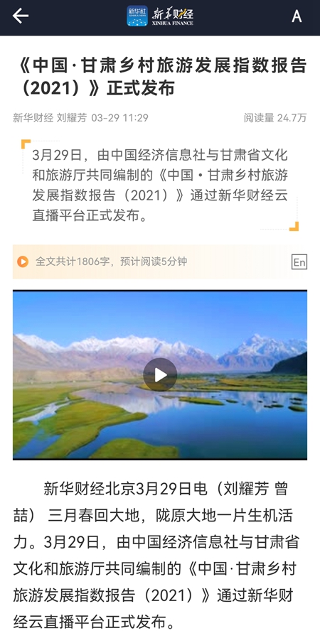 为进一步巩固脱贫攻坚与乡村振兴有效衔接,向外界传导文旅产业持续发展的前景和信心,彰显文旅行业奋发进取的勇气和决心,近日,甘肃省文化和旅游厅联合新华社中国经济信息社共同发布了《中国·甘肃乡村旅游发展指数报告(2021)》,报告发布之后得到广大网民和各大新闻媒体的高度关注和一致好评。
