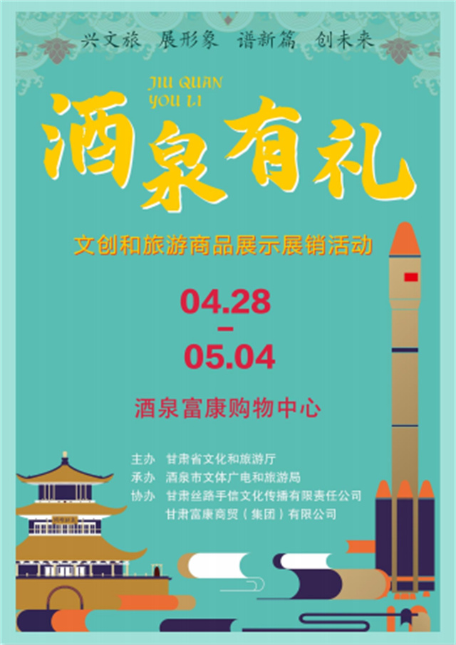 据悉,为了大力推进酒泉市国家级文化旅游消费试点城市建设,培育文化旅游商品消费热点,促进文化旅游消费水平,“酒泉有礼”——文创和旅游商品展示展销活动将于4月28日在酒泉富康购物中心开展。