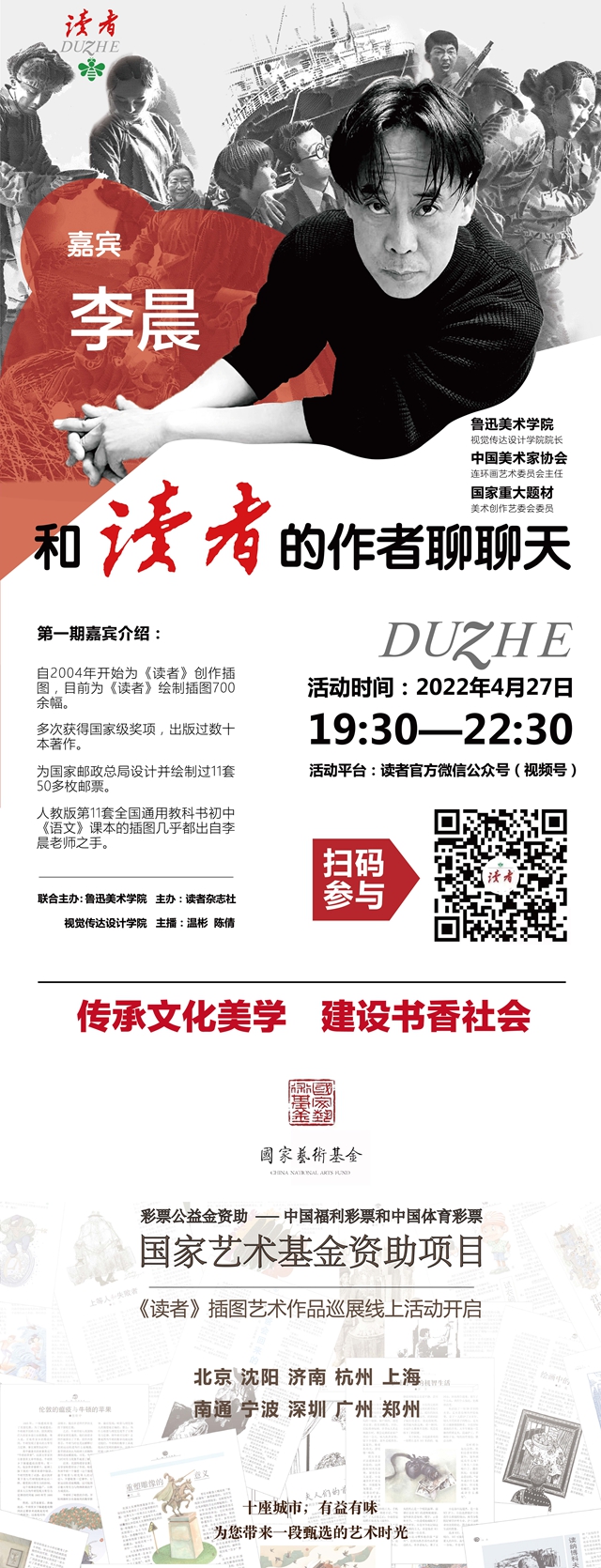 “和《读者》的作者聊聊天——嘉宾李晨”线上直播分享会,由《读者》杂志社、鲁迅美术学院视觉传达设计学院联合主办。邀请嘉宾李晨,现为鲁迅美术学院视觉传达设计学院院长,研究生导师,中国美术家协会连环画艺术委员会主任,国家重大题材美术创作艺委会委员,国家艺术基金项目——《读者》插图艺术巡展主要策展人。李晨自2004年开始为《读者》创作插图,已为《读者》绘制插图700余幅。活动时间为2022年4月27日(周三)19:30-22:30,微信用户请搜索读者官方微信公众号(视频号)参与活动。